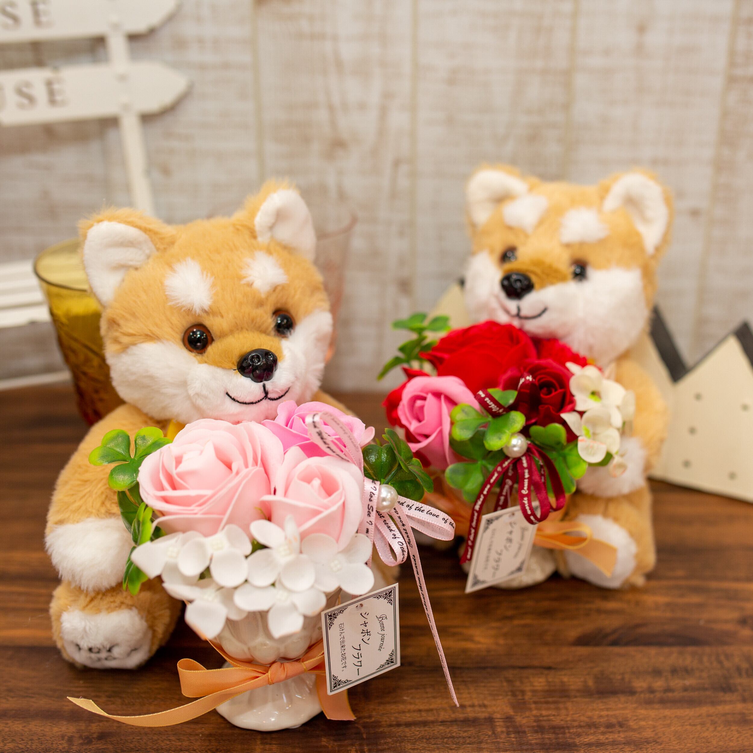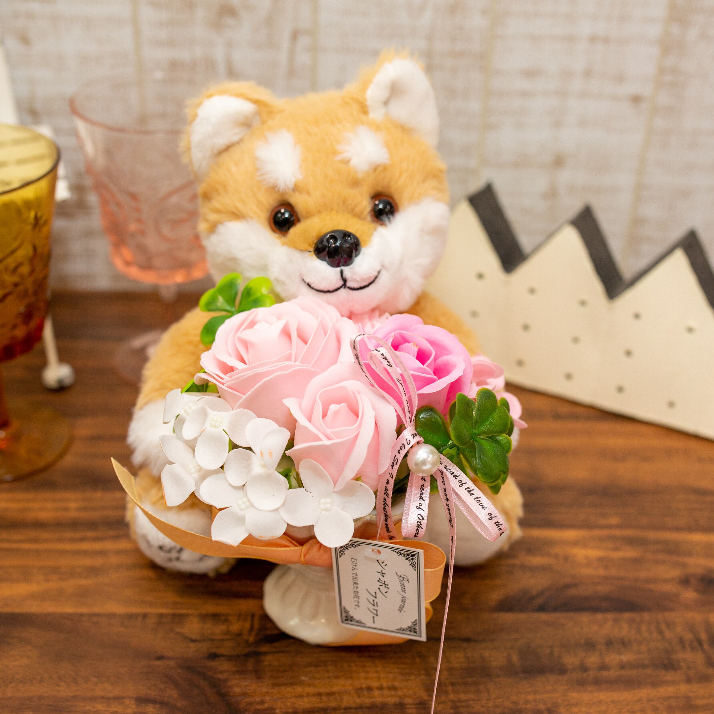 ふんわり柔らかいぬいぐるみの「豆柴のまめ」が、 シャボンフラワーのピンク系アレンジを抱っこしている商品です♪ 犬好きの方はもちろん、かわいいギフトをお探しの方にオススメです♪♪