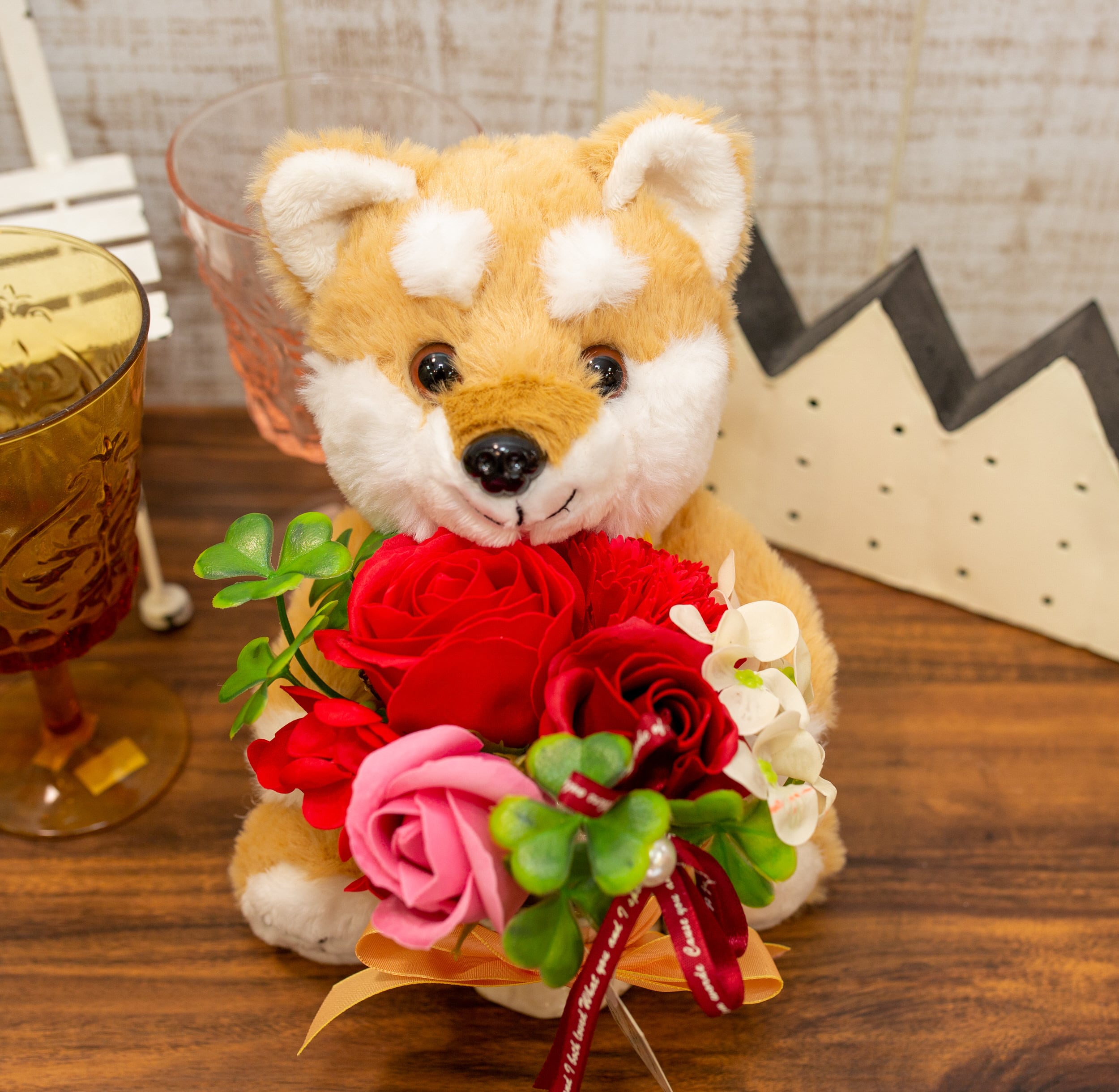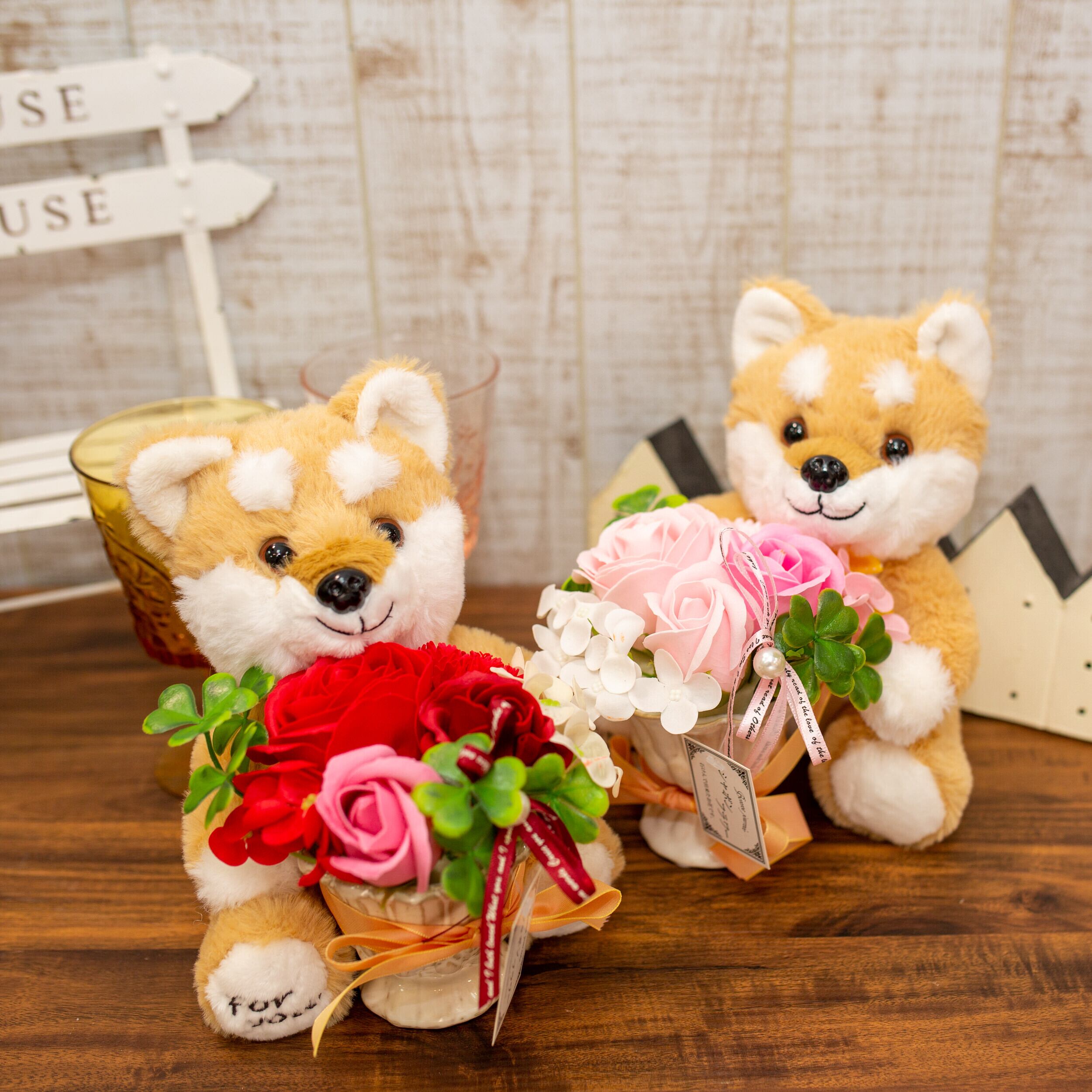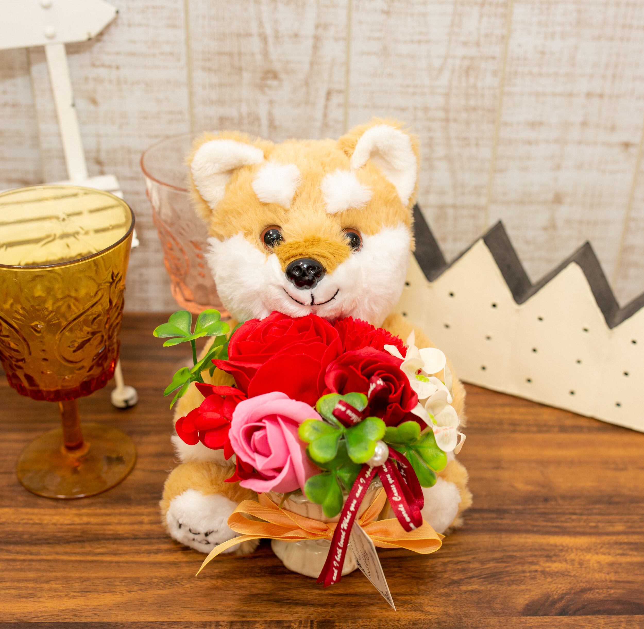 ふんわり柔らかいぬいぐるみの「豆柴のまめ」が、 シャボンフラワーのレッド系アレンジを抱っこしている商品です♪ 犬好きの方はもちろん、かわいいギフト、還暦祝いなどにオススメです♪♪