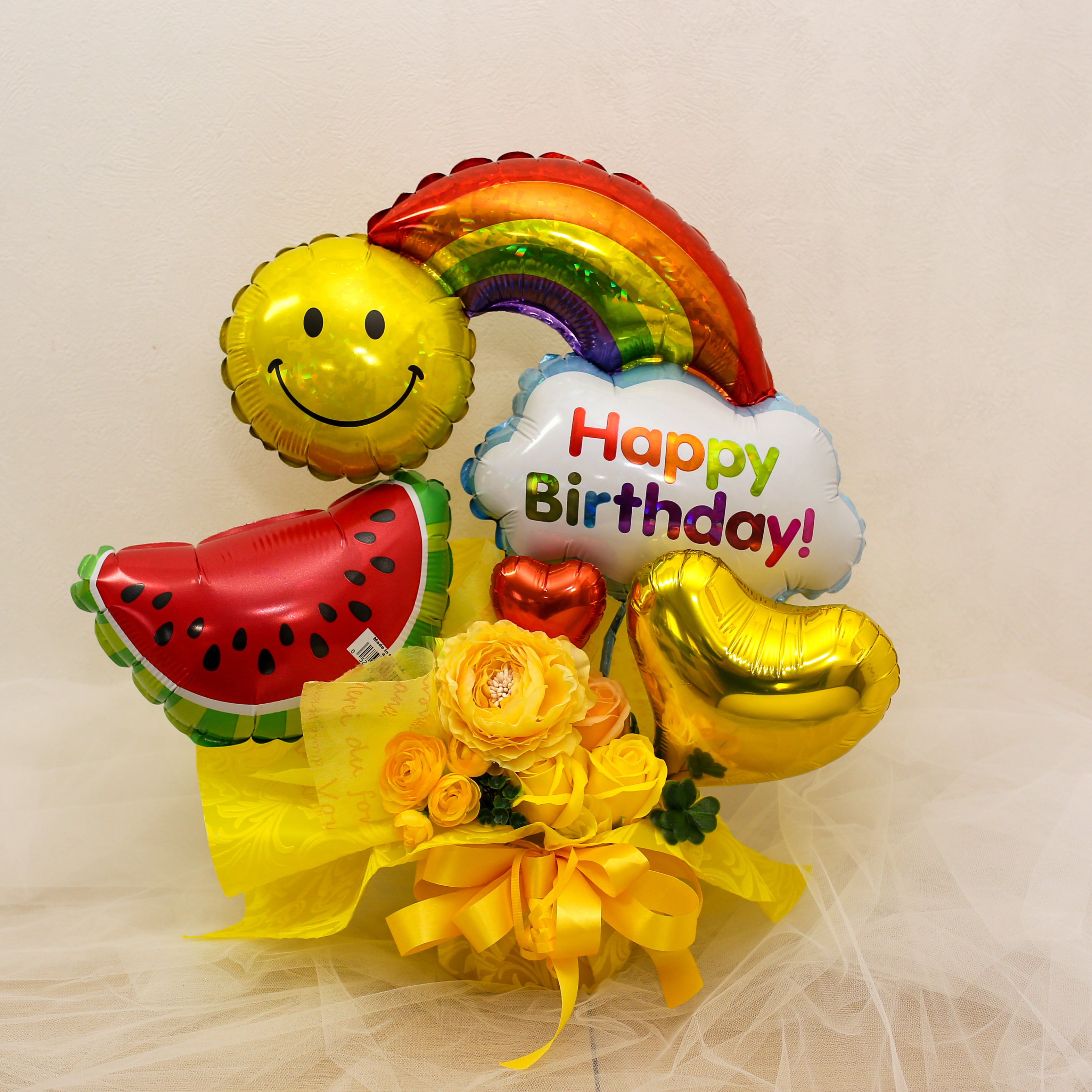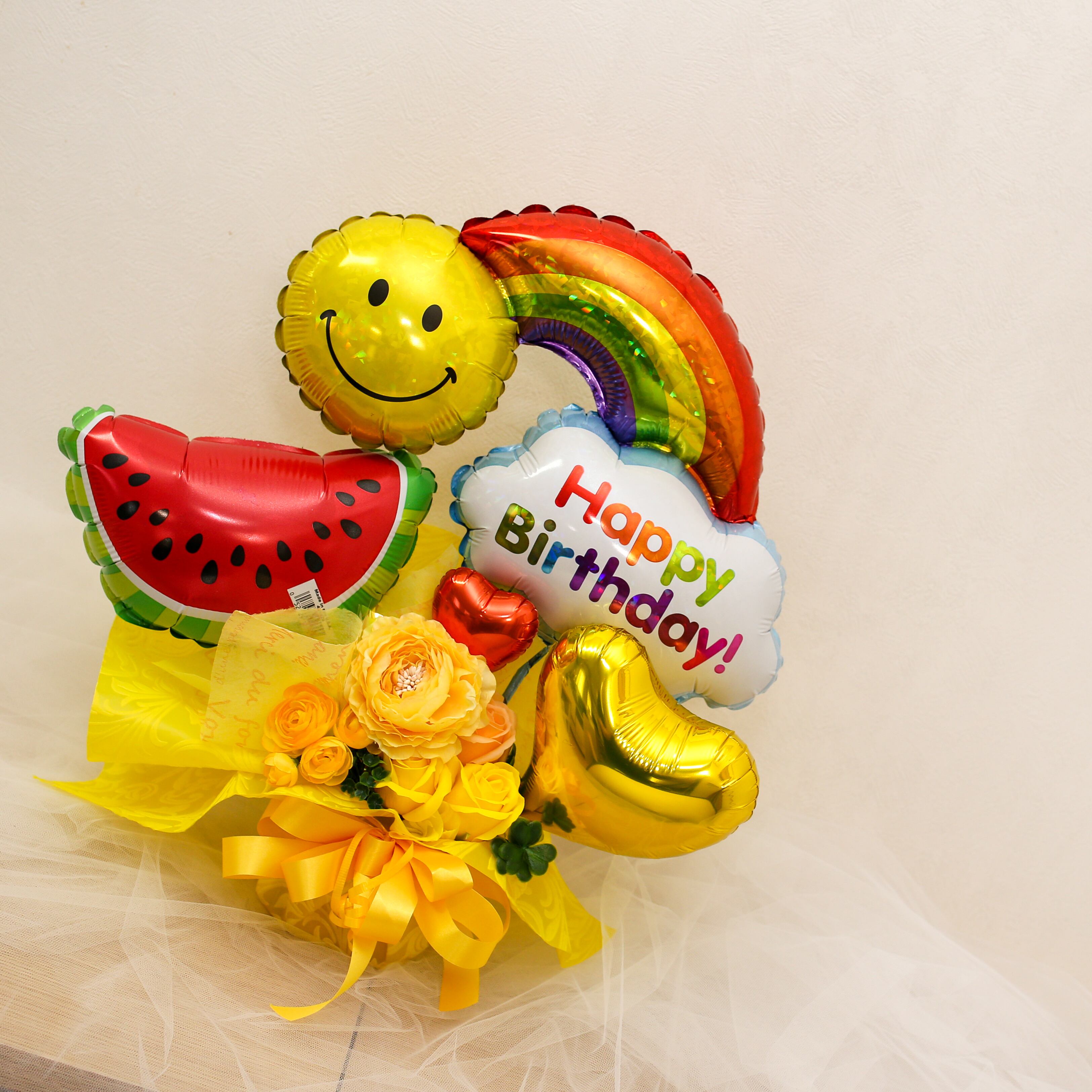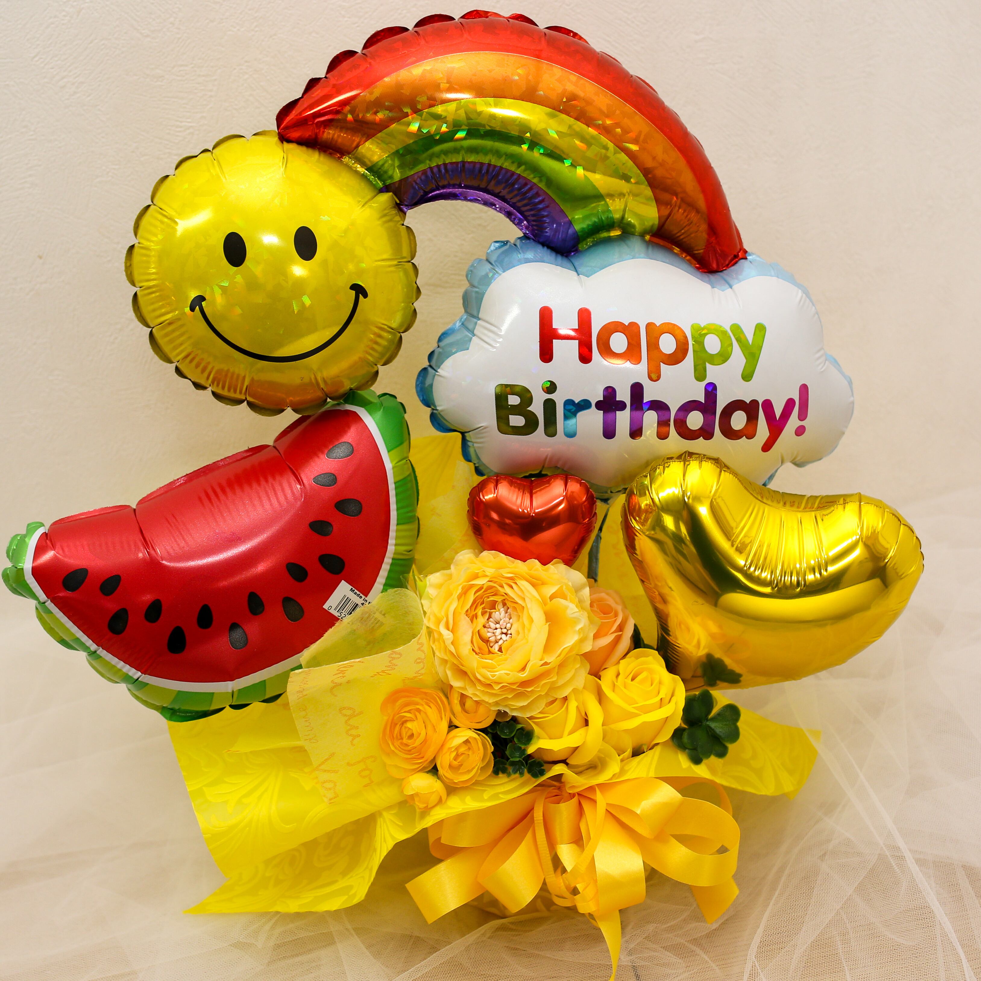 スマイルは人を笑顔にしてくれます♪ ハッピーバースデーのメッセージ入りでプレゼントにオススメです!! スイカバルーンで夏気分もプラス!バルーンとしゃぼんフラワーは長持ちでとてもオススメです♪(申し訳ありませんが北海道、沖縄、一部の離島には配送不可となります。ご了承願います。)